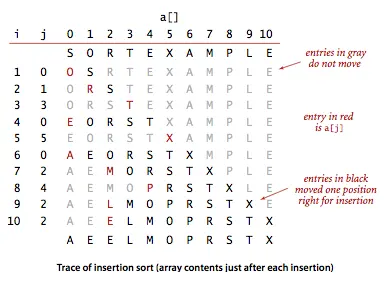 - 和选择排序一样,当前索引左边的所有元素都是有序的,但它们是我最终位置还不确定,为了给更小的元素腾出空间,它们可能会移动。当索引到达数组的右端时,数组就排序完成了。