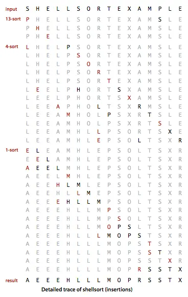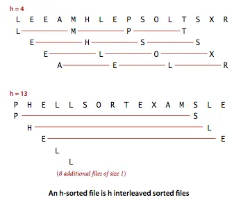 使数组中任意间隔为 h 的元素都是有序的。这样的数组被称为 h 有序数组。换句话说,一个 h 有序的数组就是 h 个互相独立的有序数组编织在一起组成的一个数组。