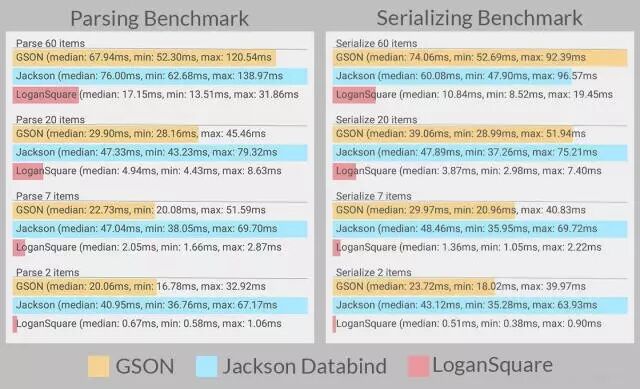 LoganSquare是近两年崛起的快速解析和序列化JSON的Android函数库,其底层基于jackson的streaming API,使用APT(Android Annotation Tool)实现编译时注解,从而提高JSON解析和序列化的性能。官网上可以看到LoganSquare和gson、jackson databind的性能对比。