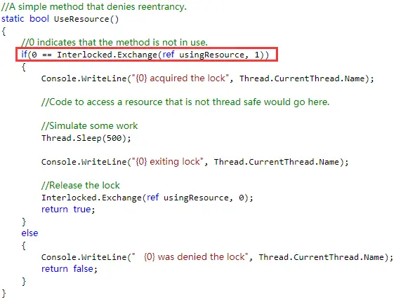 这个代码很简单,就做了2个事情,1是使用Interlocked.Exchange将_flag变量进行赋值。2是将Interlocked.Exchange操作后返回的原始值与_flag变量进行对比,如果相等说明这个变量已经被修改过了,表示这里是重入了。如果不是则说明第一次进入此方法。