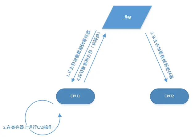 这里的5F2DFCCh其实就是_flag。我们可以看到在真正做这个Interlocked.Exchange操作的时候,并没有直接去修改5F2DFCCh地址上的数据,但是在做cmp操作的时候由于我们比较的对象是_flag变量,所以还是继续使用了5F2DFCCh地址上的数据。也就是说:CPU运算在寄存器中操作数据,但是我们用于判断的变量是个静态全局变量,持有的是这个引用地址。那么是不是可以这么来理解:【如果说Interlocked的内部操作与当前上下文使用的并不是同一个CPU核心】,那么这个“判断依据”并不是像代码上写的这样,因为我们预期是肯定一样的(变量都是同一个)。理由是做Interlocked的时候在CPU1的高速缓存中,另一个在CPU2上操作加载的数据还是内存中的。其中CPU1往内存同步数据(将寄存器中的值赋值给_flag这个全局变量)有一个非常短的时间差。如果是这样的话,也就能解释为什么会有下面的3种情况出现: