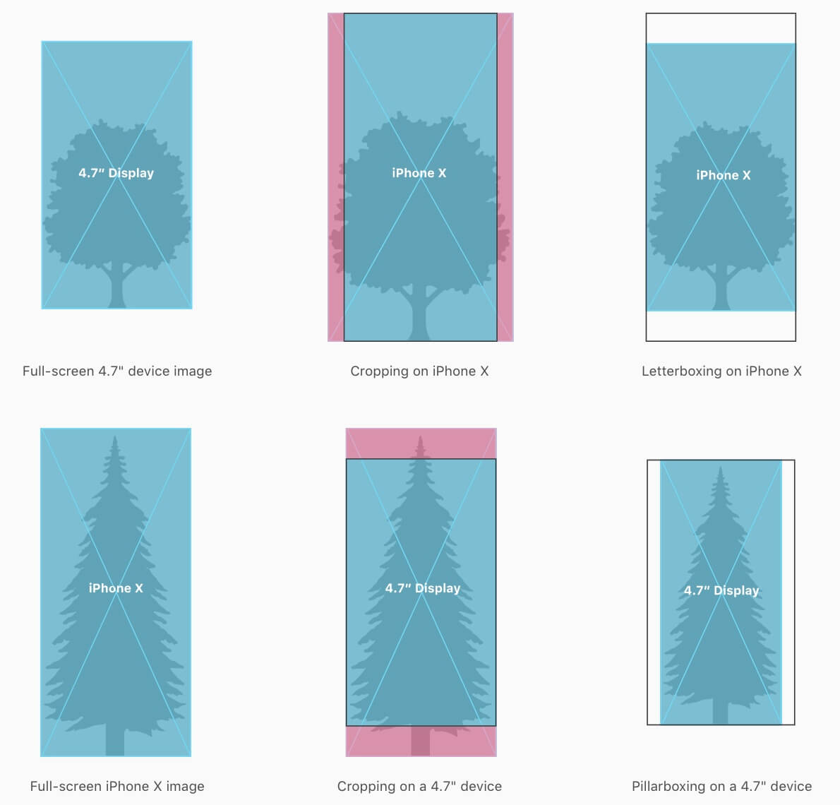 注意长宽比差异: iPhone X 具有不同于4.7“iPhone 的长宽比。因此,全屏4.7英寸iPhone 图形在iPhone X 上全屏显示时出现裁剪或 letterboxing 。同样,全屏iPhone X 图形全屏显示在4.7“iPhone 上时也会被裁剪或 pillarboxing ,因此要确保重要的视觉内容适配这两种尺寸。