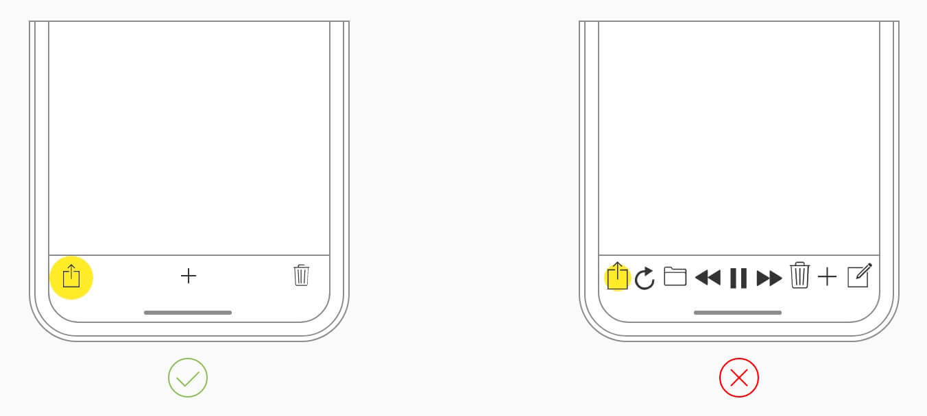 避免交互式控件出现在屏幕底部和角落: iPhone X 提供了显示屏底部的滑动手势来访问主屏幕和应用程序切换器的新交互方式,这些手势可能会取消在此区域中实现的自定义手势。 况且屏幕的两个角落过多复杂的交互也不是最佳体验的良好实践。