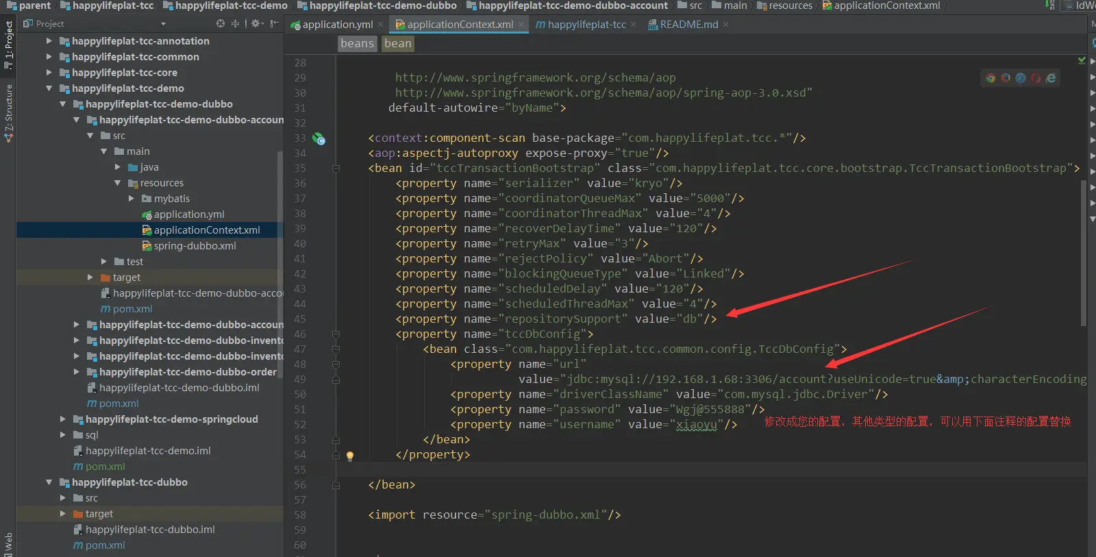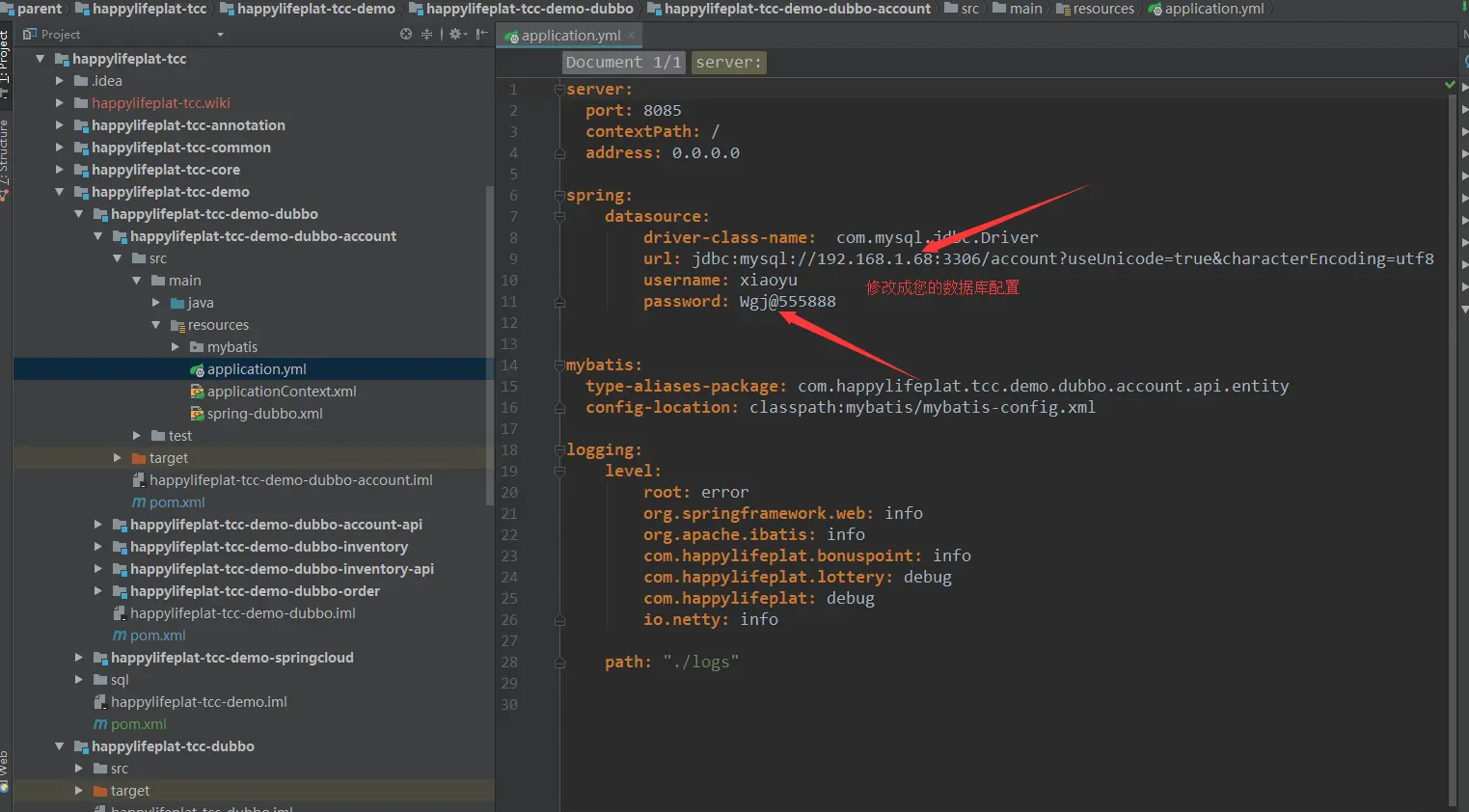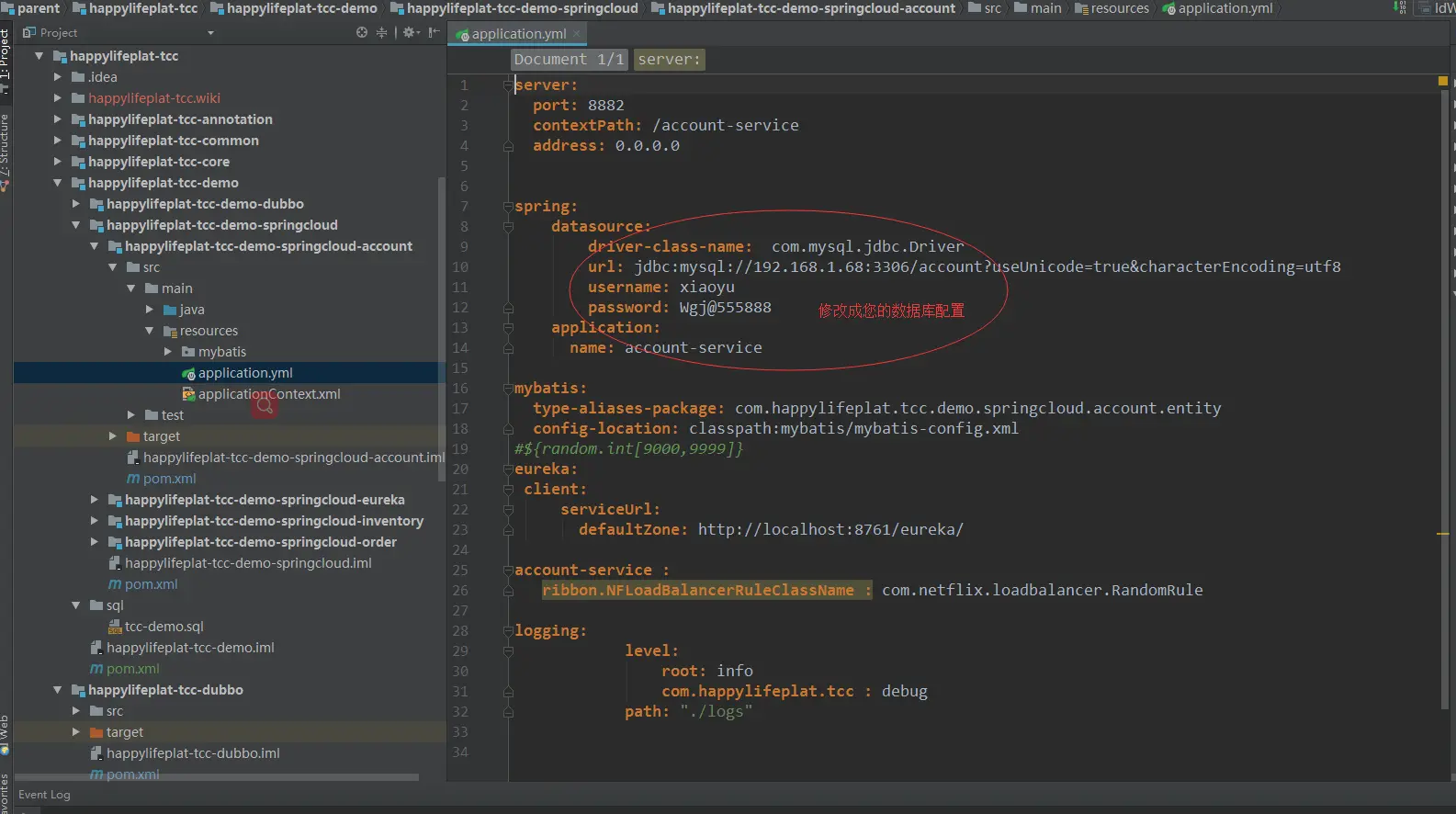 进入happylifeplat-tcc-demo-dubbo-account项目,修改application.yml中的数据库配置,如下图: