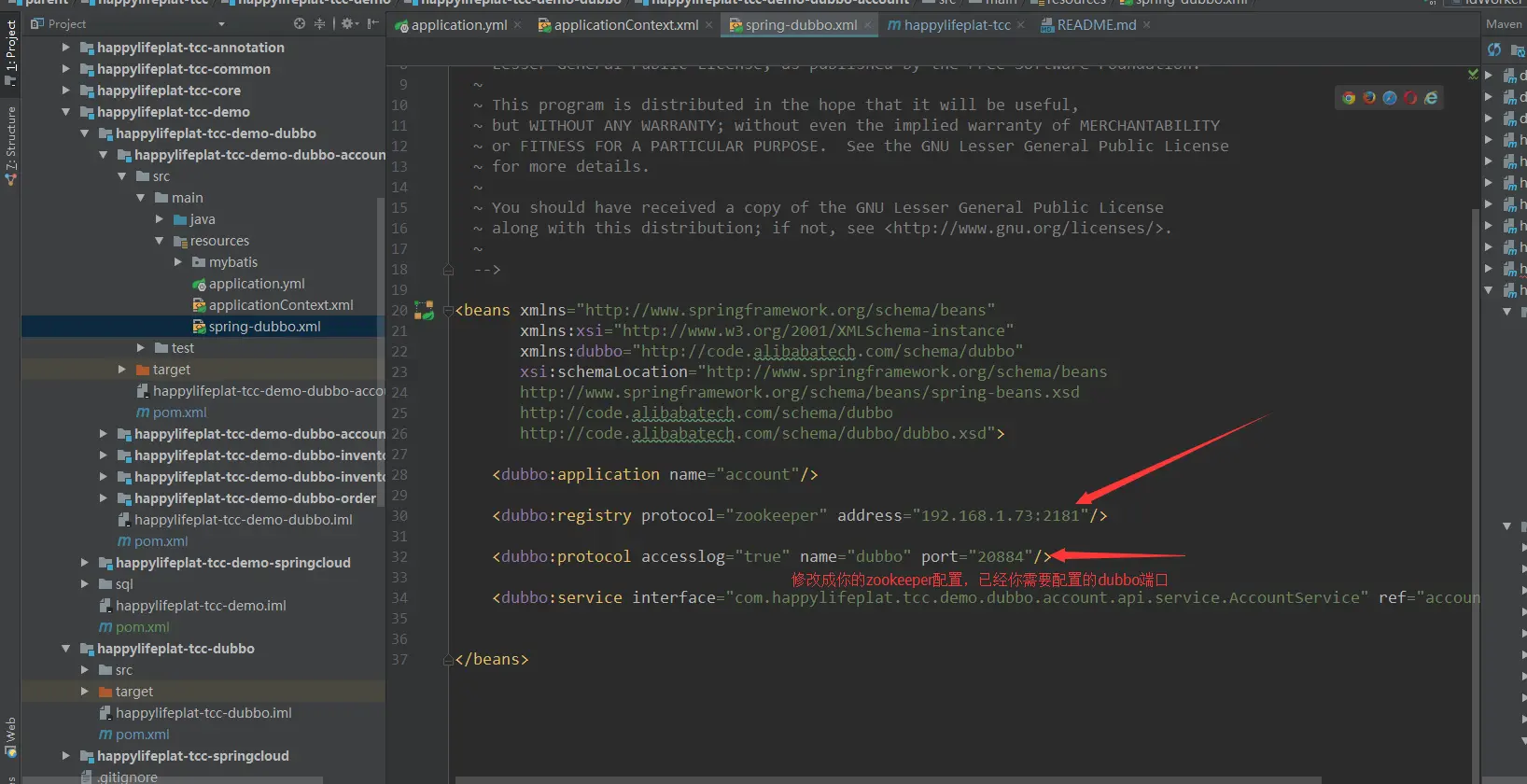 修改spring-dubbo.xml 中的zookeeper配置,如图所示: