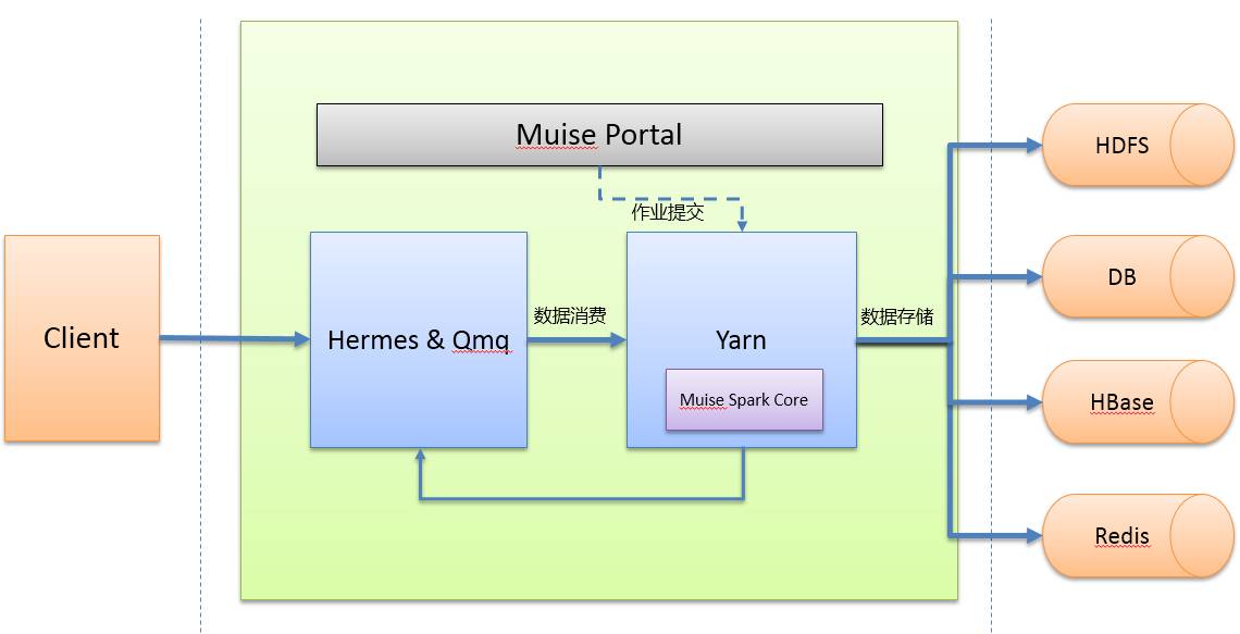 SparkStreaming作业基于Yarn Cluster模式运行,所有作业通过在Muise Portal上的Spark客户端提交到Yarn集群上运行。具体的一个作业运行流程如下图所示:
