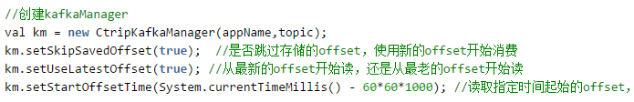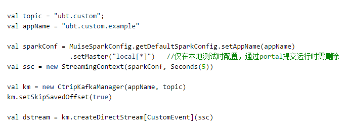 封装muise spark core的第一目标就是简单易用,让用户以最简单的方式能够上手使用SparkStreaming。首先我们实现了帮助用户自动读取与存储Kafka Offset的功能,用户无需关心Offset是如何被处理的。其次我们也对Kafka Offset的有效性进行了校验,有的用户的作业可能在停止了较长时间后重新运行会出现Offset失效的情形,我们也对此作了对应的操作,目前的操作是将失效的Offset设置为当前有效的最老的Offset。下图展现了用户基于muise spark core编写一个Spark streaming作业的简单示例,用户只需要短短几行代码即可完成代码的初始化并创建好对应的DStream: