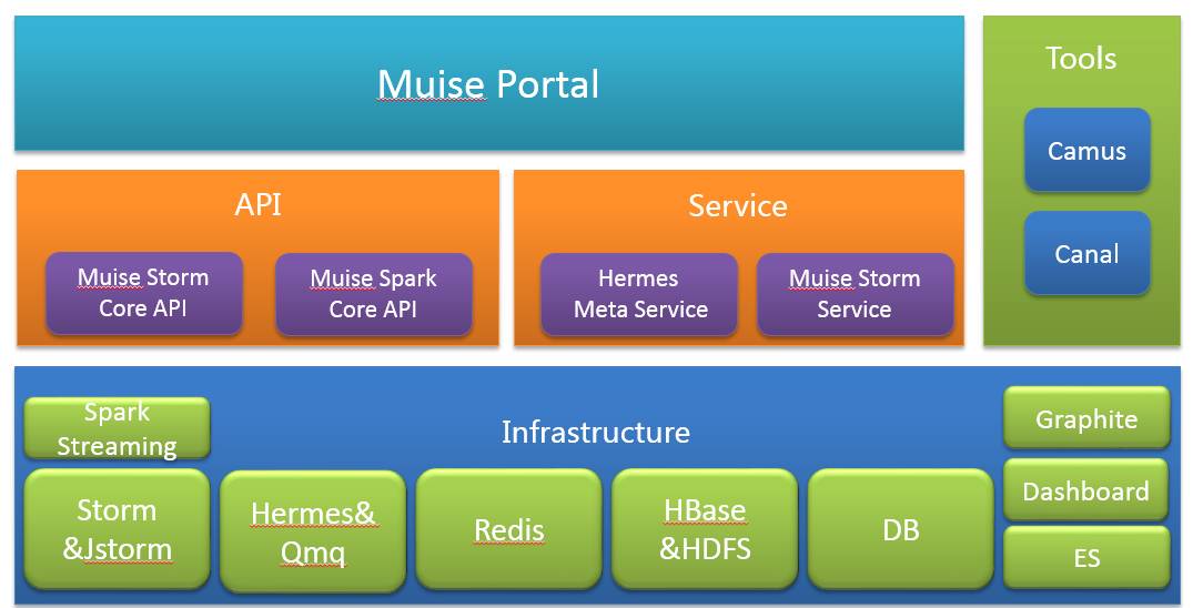 在接入Spark Streaming的初期,首先需要考虑的是如何基于现有的实时平台无缝的嵌入SparkStreaming。原先的实时平台已经包含了许多功能:元数据管理、监控与告警等功能,所以第一步我们先针对SparkStreaming进行了封装并提供了丰富的功能。整套体系总共包含了Muise Spark Core、Muise Portal以及外部系统。
