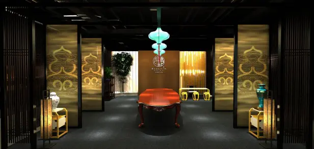 惊艳亮相。展馆设计以中式祥云纹屏风和卯榫门窗切割空间结构,中央置长形餐桌,