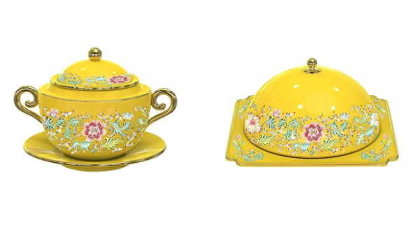 “万寿藤”,藤蔓植物)为瓷品装饰画面,寓意连绵不绝,生生不息,万世长青;以菩提叶之型设计而成菜叶盘;以金瓜之型设计而成酸奶缸;以葵瓣、海棠之型设计而成椒盐罐和点心碟;以葫芦之型设计而成筷架勺垫。万物有灵而互哺,中和之道。