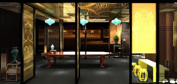 108件明黄珐琅彩缠枝纹瓷品陈列其上,独一无二的贵气,营造中国宫廷古代风味。