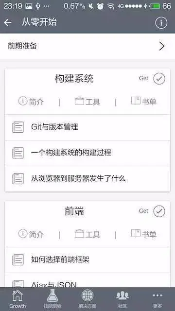 遗憾的是,上面的内容都是分散的,于是我们就有了Growth。它是一款专注于Web开发者成长的应用,涵盖Web开发的流程及技术栈,Web开发的学习路线、成长衡量等各方面。在这里,你将通过不断检验自己的学习成效,形成属于你自己的独一无二的个性技能图谱。