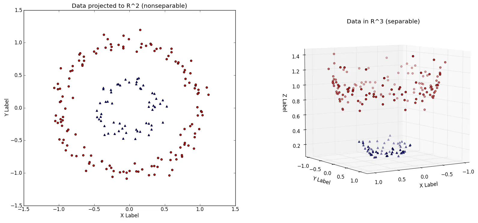 R^2中的非线性可分的数据集,以及映射到高维的相同数据集,第三个维度是x^2+y^2(来源:www.eric-kim.net/eric-kim-ne…)