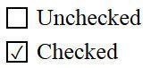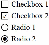 <!-- checkbox -->input[type=checkbox] + label:before { content: "¹3"; color: transparent; transition: color ease .3s;}input[type=checkbox]:checked + label:before { color: #000;}<!-- radio -->input[type=radio] + label:before { content: "\u0016AB"; border: 1px solid #000; border-radius: 50%; font-size: 0; transition: font-size ease .3s;}input[type=radio]:checked + label:before { font-size: 10px; }