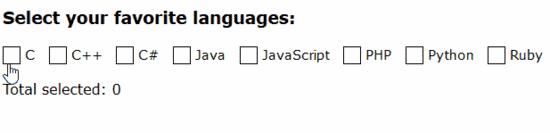 <!-- html --><div class="languages"> <input id="c" type="checkbox"><label for="c">C</label> <input id="C++" type="checkbox"><label for="C++">C++</label> <input id="C#" type="checkbox"><label for="C#">C#</label> <input id="Java" type="checkbox"><label for="Java">Java</label> <input id="JavaScript" type="checkbox"><label for="JavaScript">JavaScript</label> <input id="PHP" type="checkbox"><label for="PHP">PHP</label> <input id="Python" type="checkbox"><label for="Python">Python</label> <input id="Ruby" type="checkbox"><label for="Ruby">Ruby</label></div> <p class="total"> Total selected:</p>