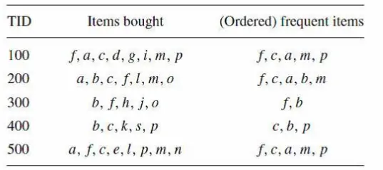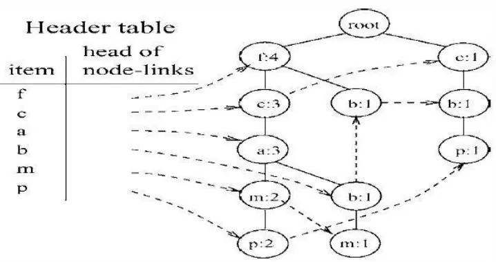FP Growth是一种比Apriori更高效的频繁项挖掘方法,它只需要扫描项目表2次。其中第1次扫描获得当个项目的频率,去掉不符合支持度要求的项,并对剩下的项排序。第2遍扫描是建立一颗FP-Tree(frequent-patten tree)。
