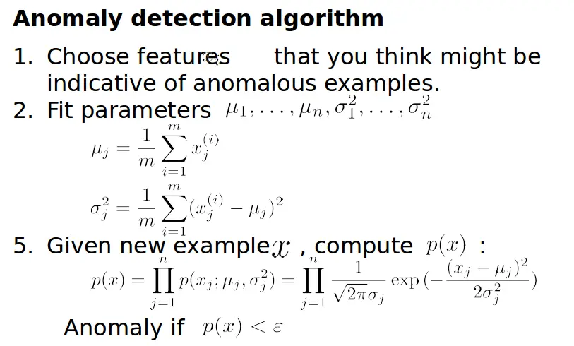 可以估计样本的密度函数,对于新样本直接计算其密度,如果密度值小于某一阈值,则表示该样本异常。而密度函数一般采用多维的高斯分布。如果样本有n维,则每一维的特征都可以看作是符合高斯分布的,即使这些特征可视化出来不太符合高斯分布,也可以对该特征进行数学转换让其看起来像高斯分布,比如说x=log(x+c), x=x^(1/c)等。异常检测的算法流程如下: