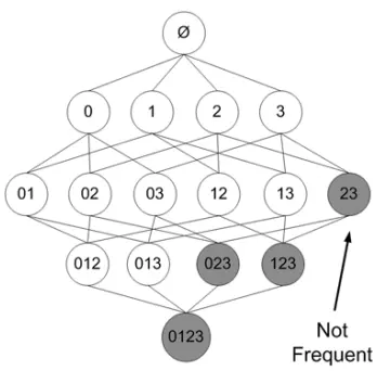 在其中某个过程中,可能出现非频繁的项目集,将其去掉(用阴影表示)为: