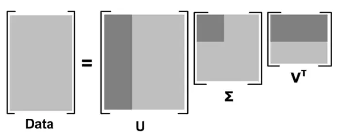 SVD将矩阵分解为三个矩阵的乘积,公式如下所示: