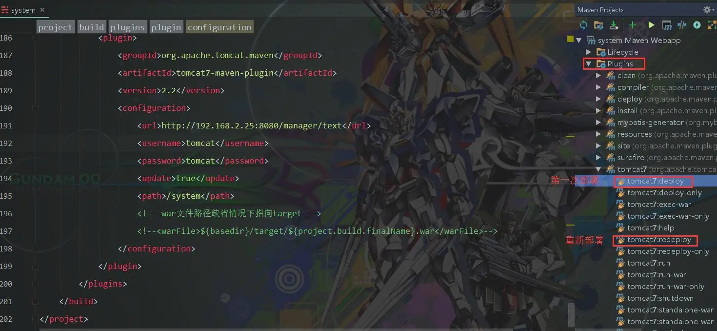 如果读者使用的是 Eclipse 工具,可以右键 pom.xml 文件选择 Run As -> Maven build... -> tomcat7:deploy 或 tomcat7:redeploy