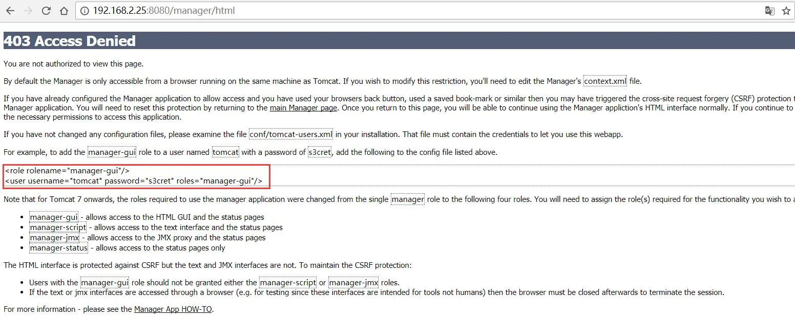 启动 tomcat 服务,在浏览器打开 http://192.168.2.25:8080,添加右侧的 “Manager App”,如果出现如下情况: