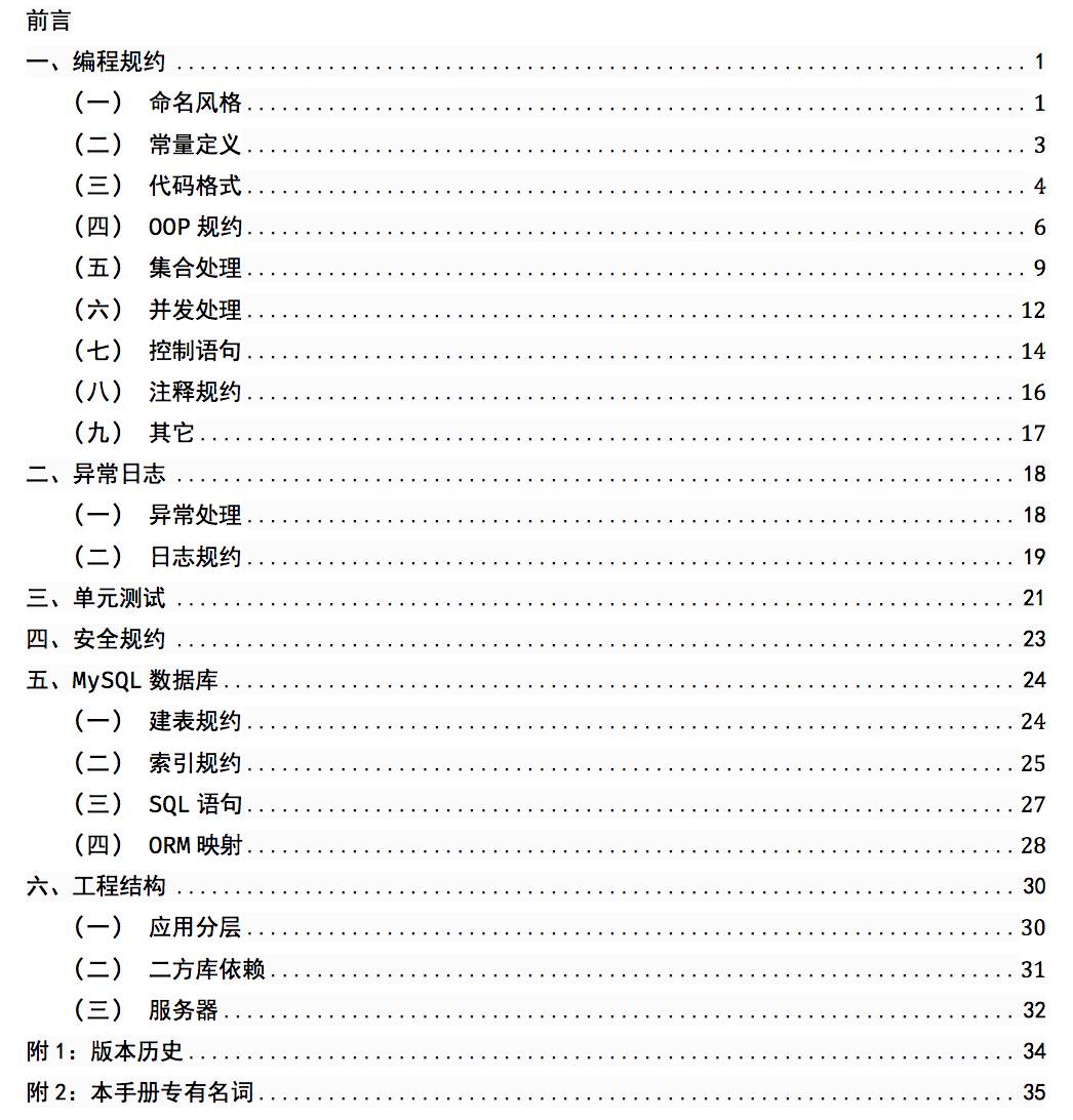 历经数次迭代更新,终于在九月份,这套手册迎来终极版,也是阿里官方对外发布的最后一个 PDF 版本。与此同时,也正式面向海外发布英文版。我们来看一下终结版的目录都有哪些内容: