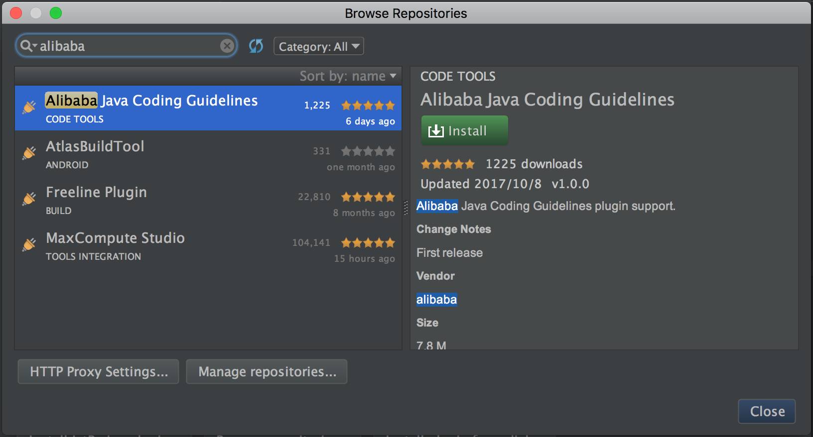 这以我们经常使用的 Android Studio 工具为例,依次打开 [Preferences],[Plugins],[Browse repositories],搜索 alibaba 关键字,便能一键安装插件: