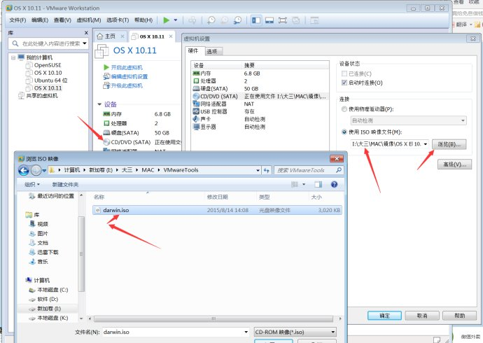 把虚拟机关掉(点击小苹果那里有个关机的选项),按照下图设置光盘进入darwin.iso 映像,光盘设备的状态是启动时自动连接。这些工具,我都有分享,就在文章的首页的百度云盘链接里,记得下载齐全。
