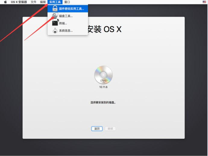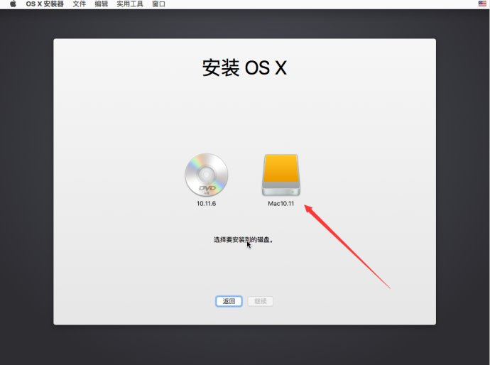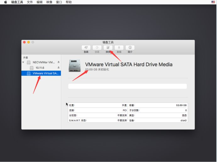 设置好语言后,下一步,来到安装的位置。这里需要主意,Mac 有其自己的硬盘格式,所以这里无法识别第八步设置的硬盘,这里需要将磁盘抹成Mac 能识别的格式。打开磁盘工具。