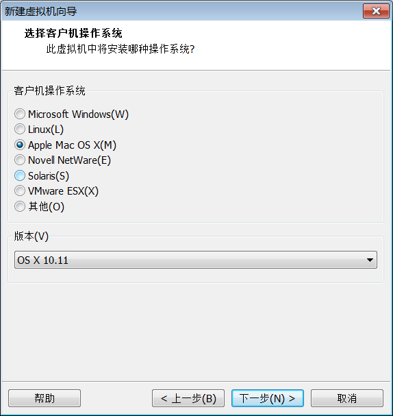 安装完Mac OS X Unlocker for VMware V2.0.7插件后,这里应该有Apple Mac OS 的选择,如果没有就是插件安装失败,需要回到第二步,重新来,记得看压缩包里的教程。选择跟你映像对应的虚拟机,下一步。