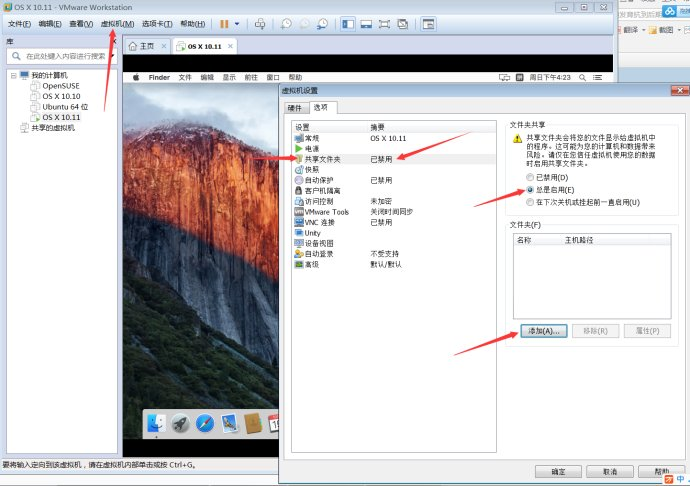 选择,虚拟机-->设置-->共享文件,启用共享文件,添加文件路径。