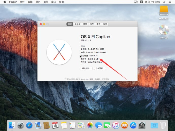 半个小时过去了,终于进入了Mac 系统,这时候Mac 很卡,因为有些东西还没弄好,你在系统的左上小苹果图标的位置打开关于本机,你就会发现图形卡 显示器栏才只有3 MB,接下来安装VMware Tools 能够提升到128MB,会流畅一点。下面我们将安装VMware Tools。