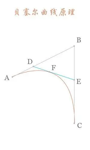这样获取到的点F就是贝塞尔曲线上的一个点,动态过程如下: