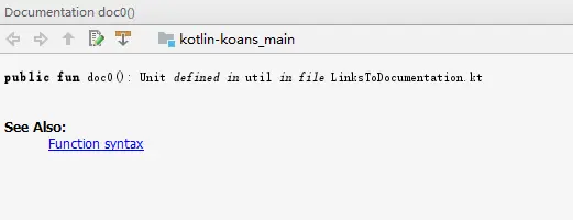 }阅读TODO中的内容,首先要求我们阅读README.md文件,学习如何使用该项目,了解通过该项目能学到什么,并给出了Hello_World练习的答案。然后是教我们使用在线文档,可以看到代码中有一个doc0()函数,将光标移动到该函数位置,按下 'Ctrl + Q'(Mac OS按 'F1')可以打开快速文档,这里是Kotlin的详细文档,点击链接便可在浏览器中查看。注意一定要将光标移动到该函数位置,只是将鼠标悬停在函数上方是不行的。