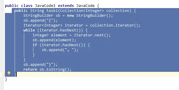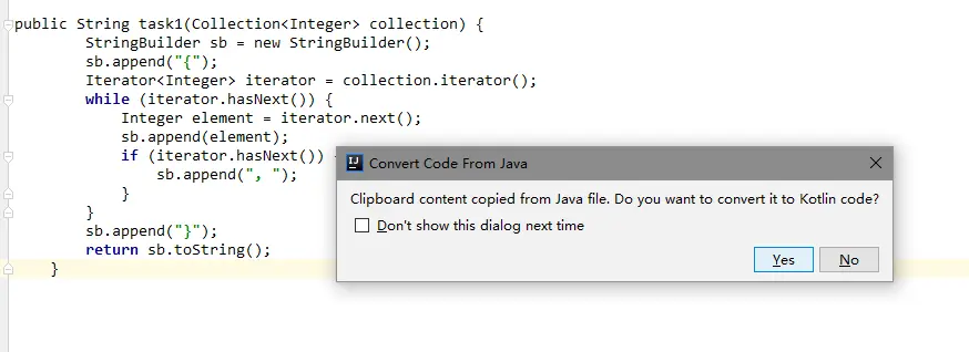 该练习教我们使用把Java代码转为Kotlin代码的工具,Intellj IDEA 自带了这个工具,我们将JavaCode1.java中的task1方法复制到n01JavaToKotlinConverter.kt中,直接覆盖对应的task1函数就好了