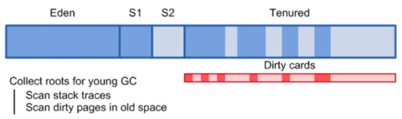 在Minor GC过程中,垃圾收集器只会在脏卡中扫描查找年老代-新生代引用。