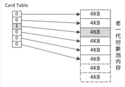 卡表作为一个比特位的集合,每一个比特位可以用来表示年老代的某一区域中的所有对象是否持有新生代对象的引用。