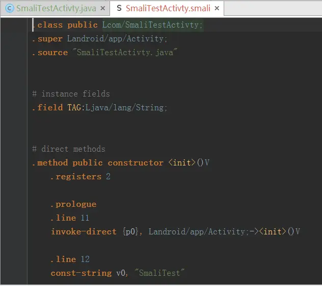 接下来我们就可以对照着java代码来逐行分析这个smali文件。如果是第一次看我们可能会被一些没见过关键字干扰到。其实这里有个很简单的办法。注意.line关键字就是用来描述当前代码在java源文件中的行数。然后你可以通过对照两组代码的方法进行反推。这样就可以很轻松的学会看smali文件。