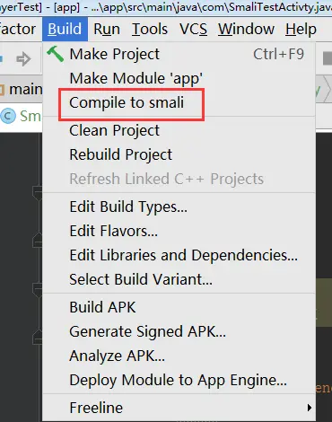 这个步骤以后,我们就可以愉快的将任何java代码在androidStudio中直接转换成smali来学习里。步骤如下。