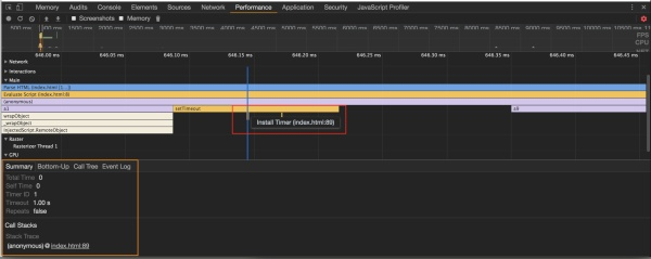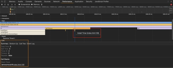 红色框里的文字,是鼠标移上去看到的字,橙色框是详细信息,点击最后一行 index.html 可以看到具体代码,这里忘了截图。戳进去会跳转到第一个setTimeout那一行(也就是89行)。