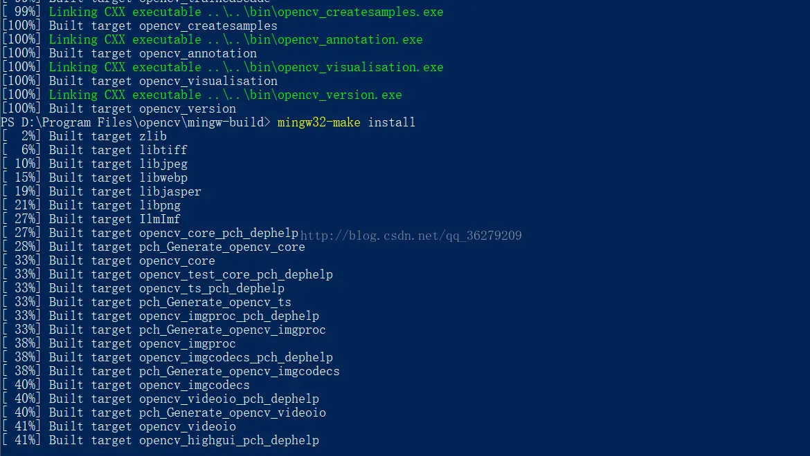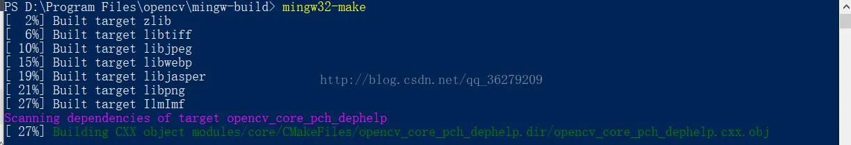 在编译输出根目录打开cmd或powershell,输入`mingw32-make`,然后开始生成库文件。