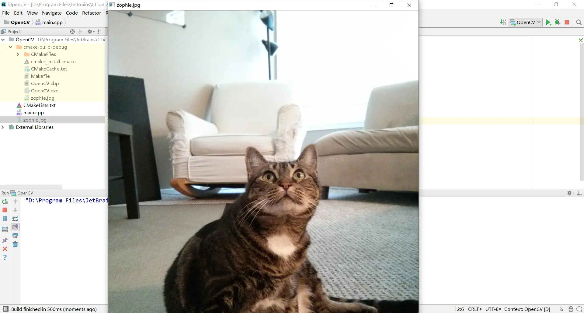简单的读取和输出图像,要把使用的图像放到main.cpp所在的路径,也要复制到生成的cmake-build-debug文件夹里。 运行一下