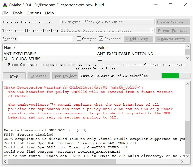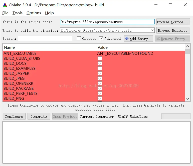 如上图所示,在第一行填入openCV源文件路径,第二行填入输出文件的保存路径,最下面一个current generator选择mingw,注意所有路径都不能包含中文字符。 然后点击configure就可以编译源文件了,刚开始的红字可以不用理它.