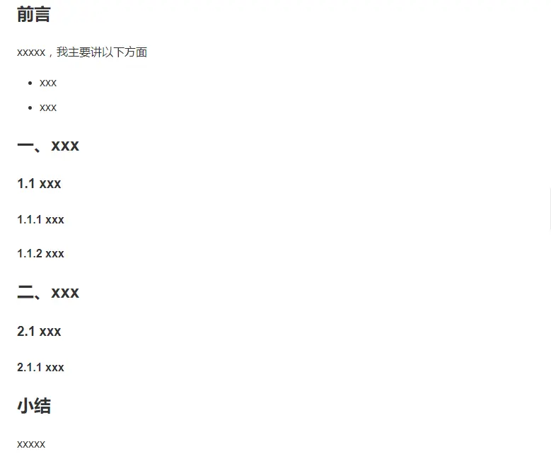 接下来我们可以把前言中提到的几个方面作为大标题,然后开始写具体内容,如果该内容太多,可以把内容再拆分下,列出几个小标题。如果小标题内容也还是多,那可以再拆分,介最好不要超过三层,因为层级太多反而看得眼花缭乱。