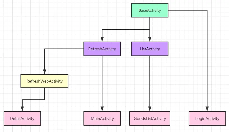 明显的,DetailActivity是一个带有刷新web功能的界面,MainActivity则是可以刷新的主页面,GoodsListActivity是一个带有列表的商品清单界面,LoginActivity是一个普通的界面,功能单一,直接继承自BaseActivity。这么设计的好处在哪里呢?像带有列表的界面,对于一般的项目而言,通常少则出现几次,多则十几次几十次,这时如果我们直接继承自BaseActivity就会造成,列表的逻辑重复写很多次。