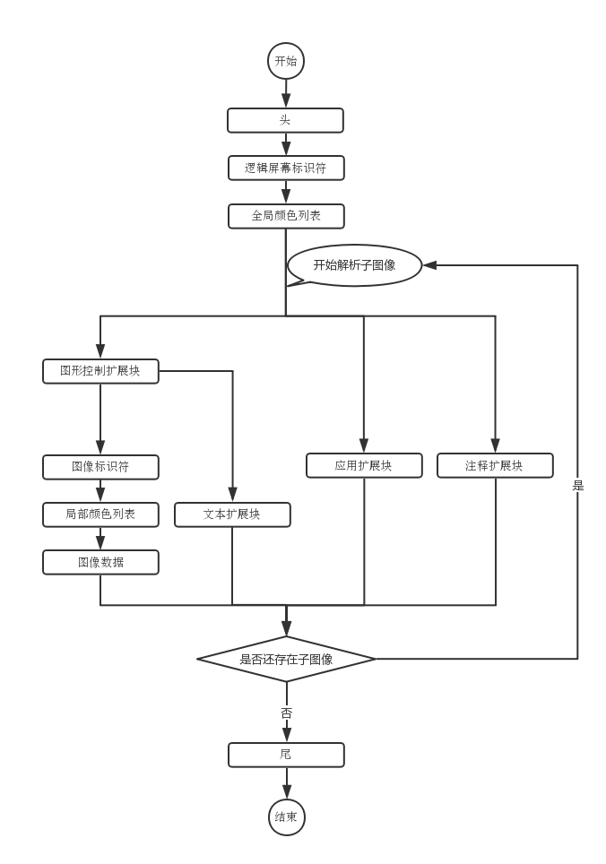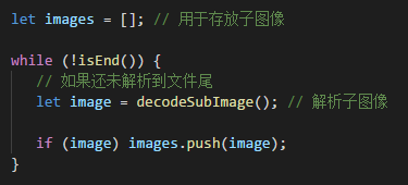 解析完上面两个全局块后,就要开始解析子图像了。解析子图像是一个循环的过程,每个子图像属于一个大数据块,直到我们解析到文件尾才表示我们已经解析完所有的子图像,用代码表示则是: