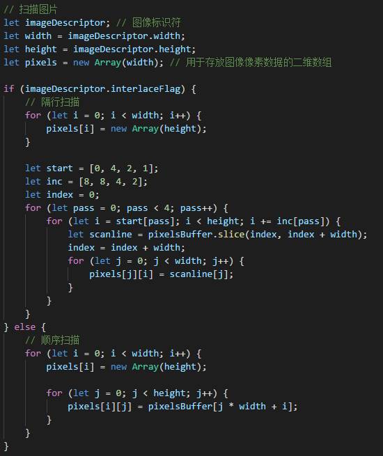我们在解析完图像数据后,需要将数据存到一个二维数组中,这样我们可以直接通过坐标的方式读取每个子图像的像素颜色值。这个存取过程中涉及到图像的两种扫描方式:顺序扫描和隔行扫描。顺序扫描很好理解,而隔行扫描相对复杂一点。