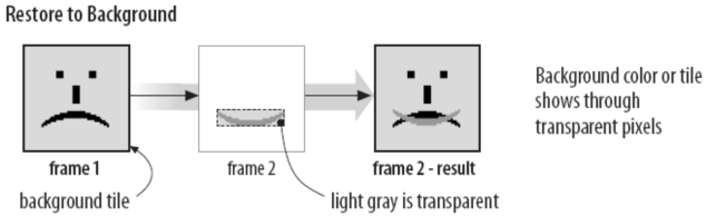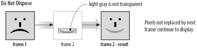 其中比较特别的是处置方法和延迟时间。其中延迟时间解析方式和逻辑屏幕标识符中的图像宽高一样,需要将字节调转过来解析,其单位为1/100秒;处置方法是为了复用一些其他帧的数据才会出现的优化方式,我们可以将其看成是增量存储的优化的,其值的解释则如下:
