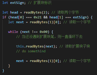 扩展块头固定为0x21,扩展块尾固定为0x00。扩展块中间包含若干个扩展块子块,在解析扩展块子块时需要一直循环直到遇到扩展块尾才结束,用代码简单表示如下: