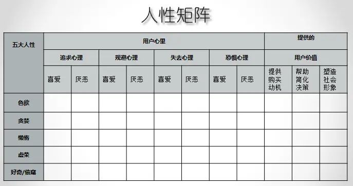 第三、绘制人性矩阵。我们分析用户的行为中暗含的基本人性,研究用户心理是喜欢还是厌恶这种感觉。针对不同的用户心理,思考我们提供的产品或服务是否可以为用户实现某种用户价值。具体可参考图2进行绘制。